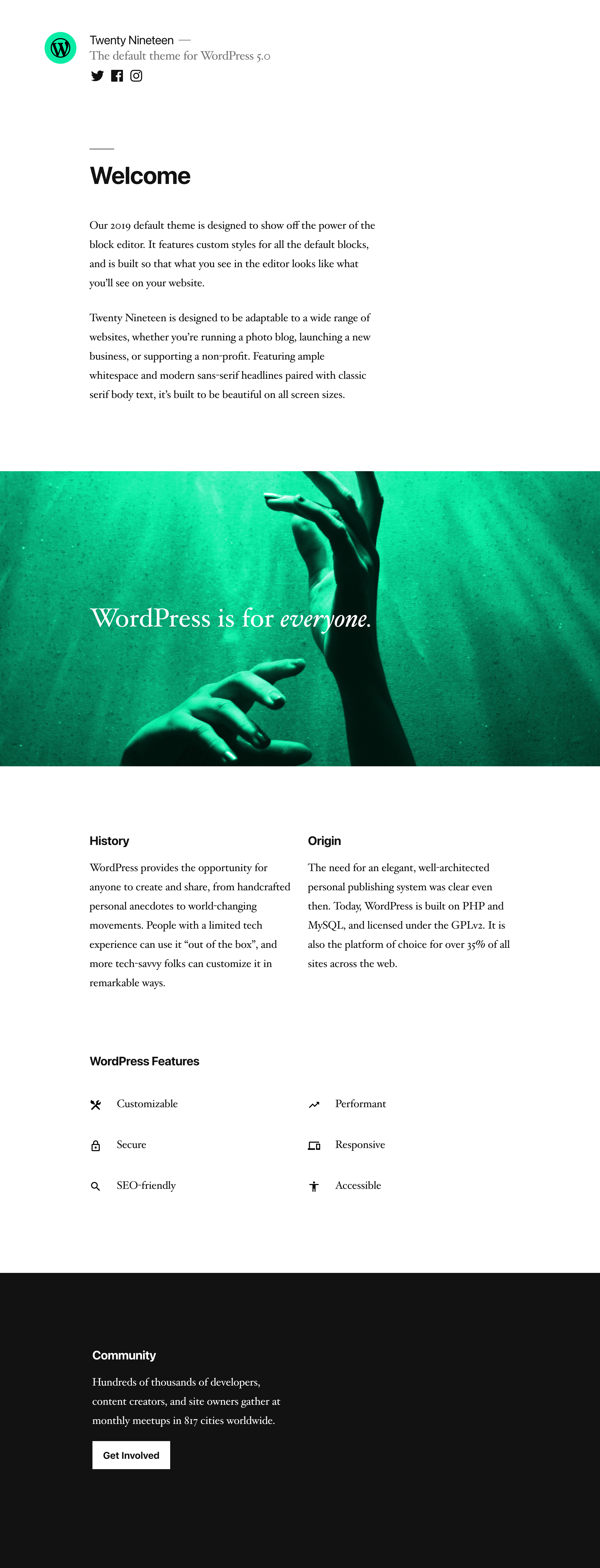 Twenty Nineteen relies on a beautiful and performant system font stack that marries traditional serif body text with modern sans-serif headings. Among its most striking design features is its optional duotone-style image filter for featured images. I've always thought of it as a blogging theme at heart, but like any good default theme, it’s versatile. We built the theme's official demo site to showcase its use as a small business' theme.