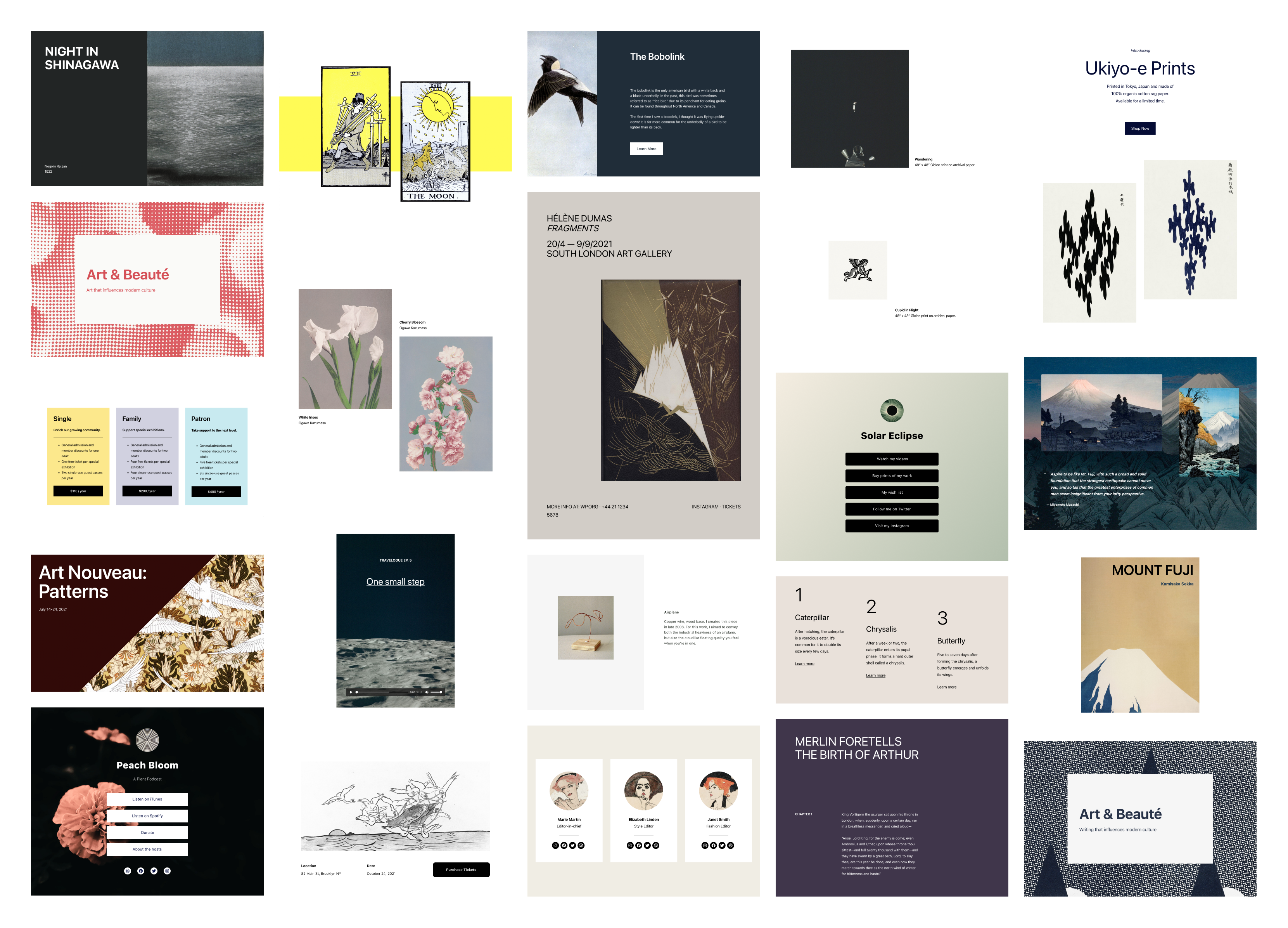 Since this collection of 70+ patterns would be presented all together in the UI, visual cohesion was important. Thematically, all Patterns in this collection draw from literature and art to reinforce block patterns as a new outlet for creative expression. We used vintage public domain imagery and embrace offset, irregular layouts to showcase new design tools available in WordPress.